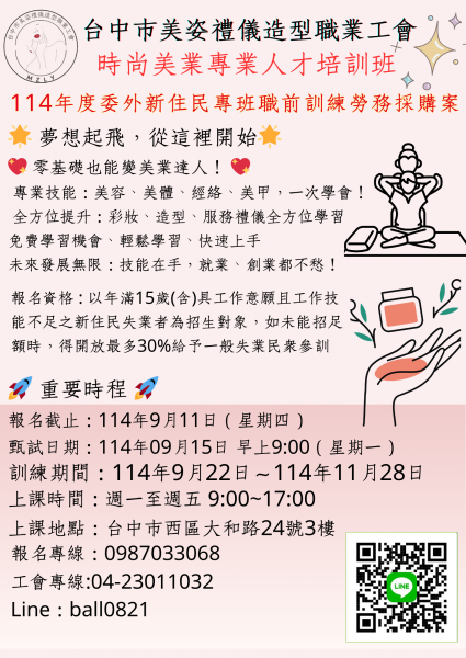 | 0基礎也能學,讓妳從素人變專業 美容|美體|經絡|美甲|彩妝造型 一次學會多項技能,結訓就能上工! 還有完整服務禮儀訓練,走到哪都專業滿分! 招生對象:年滿15歲(含),有工作意願且工作技能不足之新住民失業者 (如未能招足額時,得開放最多30%給予一般失業民眾參訓!) "符合身分還能領生活津貼" 【課程資訊】 訓練時間:9/22 ~ 11/28(週一至週五 9:00-17:00) 地點:台中市西區大和路24號3樓 報名截止:9/11(四) 筆試時間:9/15(一)上午9點 報名專線:0987033068 工會電話:04-23011032(王秘書) 加入LINE詢問:ball0821 報名連結: https://its.taiwanjobs.gov.tw/Course/Detail?ID=157696 |